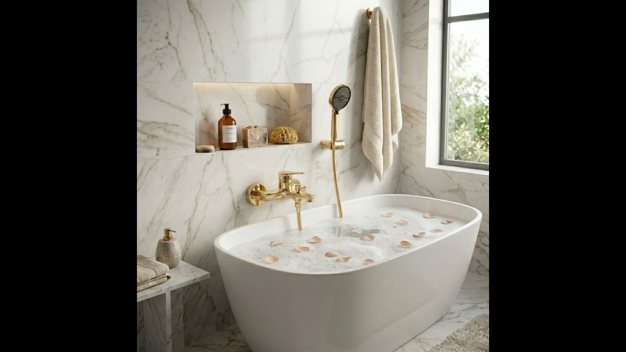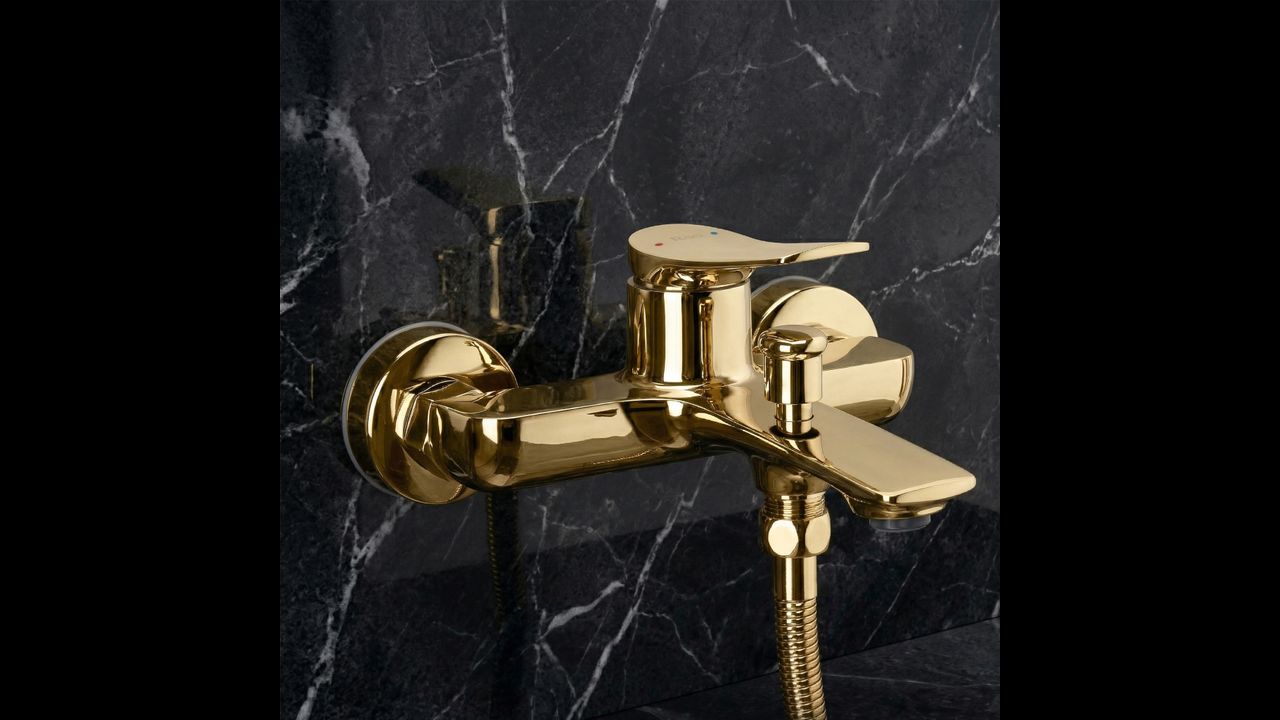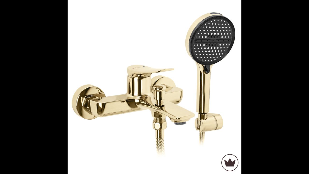A Vision arany színű kádcsaptelep elegáns választás a modern és kifinomult fürdőszobákba. Karcsú, karakteres formája, fali szerelési módja és csillogó arany felülete luxus megjelenést kölcsönöz, és kiemeli a fürdőhelyiség presztízsét. A zuhanyfejjel kiegészített készlet praktikus és esztétikus megoldás, amely ékszerszerű ragyogást visz a belső térbe.