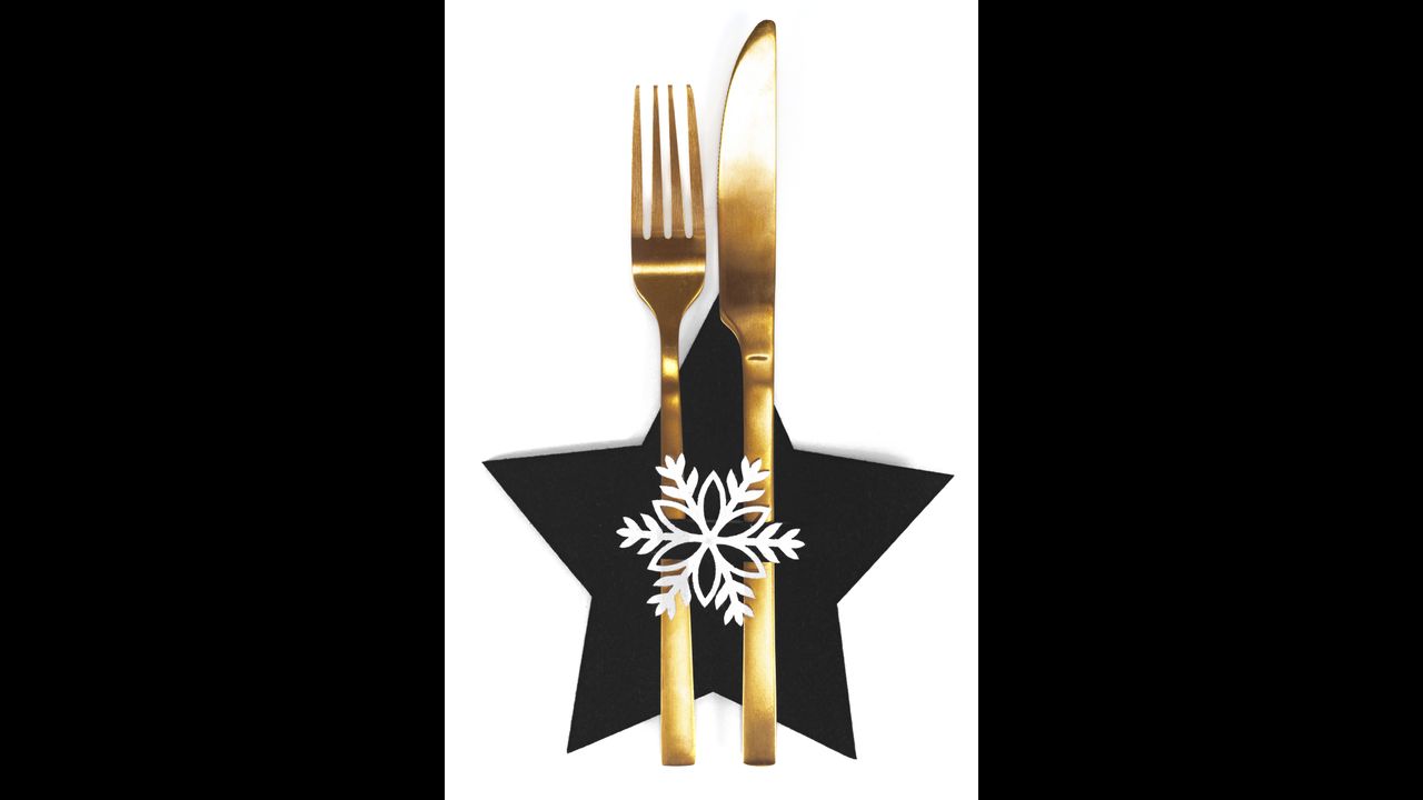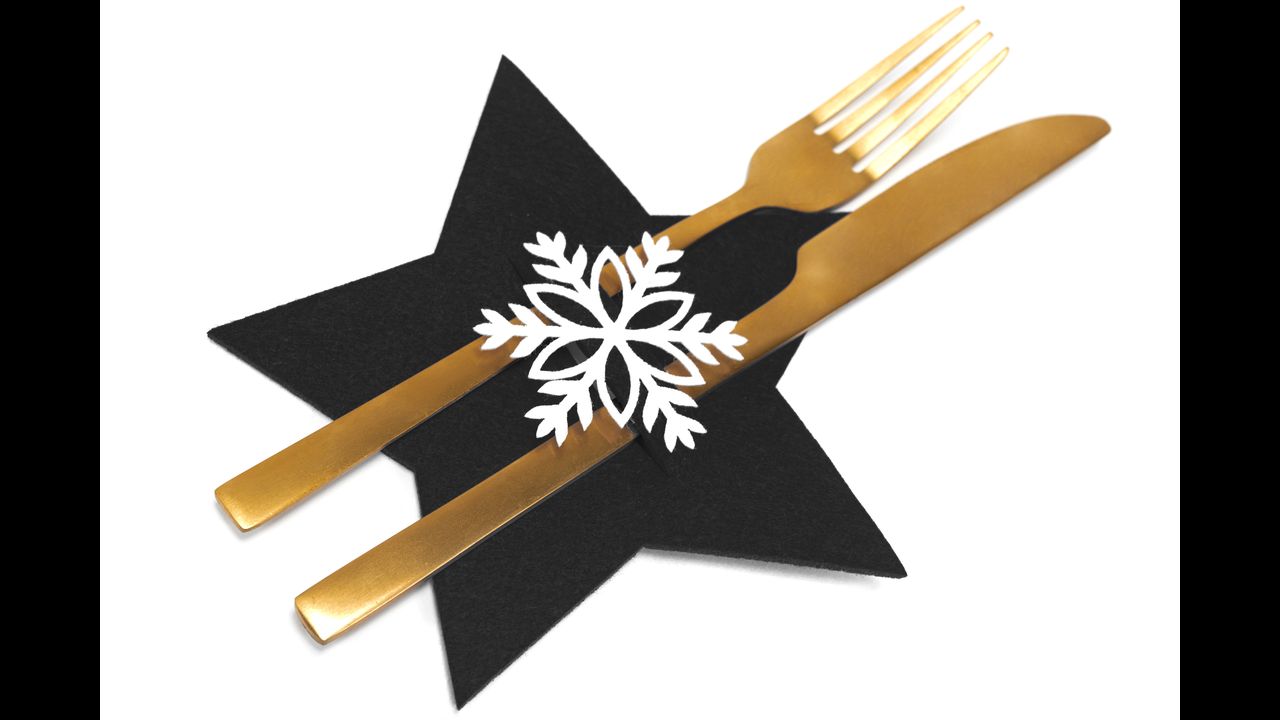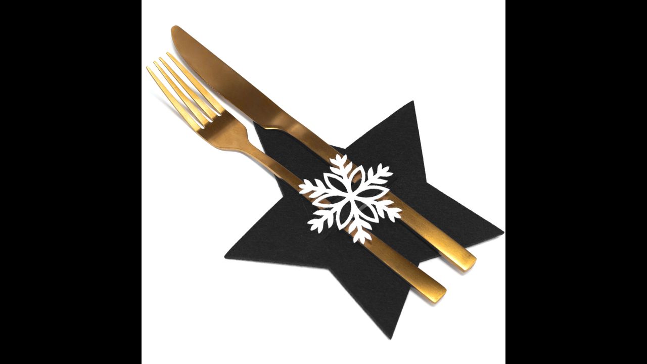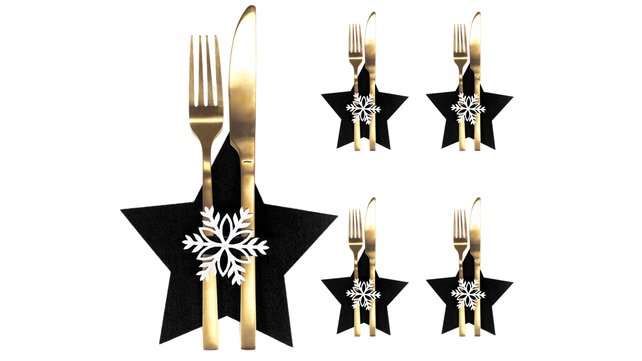 Gyönyörű fekete evőeszközhuzatok csillagmintával. Gyönyörű lakberendezés az ünnepi szezonra. Egyedülálló befejezésük lesz a szenteste asztalán